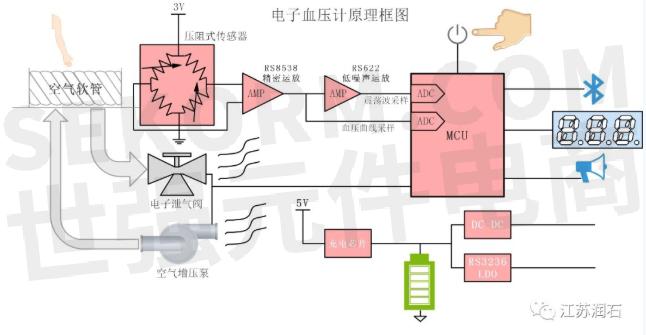 图中,空气软管连接袖带,在机器侧,通过一个压阻式传感器来感知目前袖带的压力。压阻式传感器内部实质为一个惠斯通电桥,接受一定压力时,电桥各臂的阻值会发生变化,利用一个精密运放 RS8538 组成差分放大器,可以把压力信号转换成电压信号。示波法测量需要先找出叠加在输出直流信号中微弱震荡波的最大值,也就是找到了血压的平均压力,然后利用对应关系,再找到收缩压和舒张压。意味着 MCU 既要采集放大后的直流电压,也要采集去掉直流电压后放大的交流震荡波。